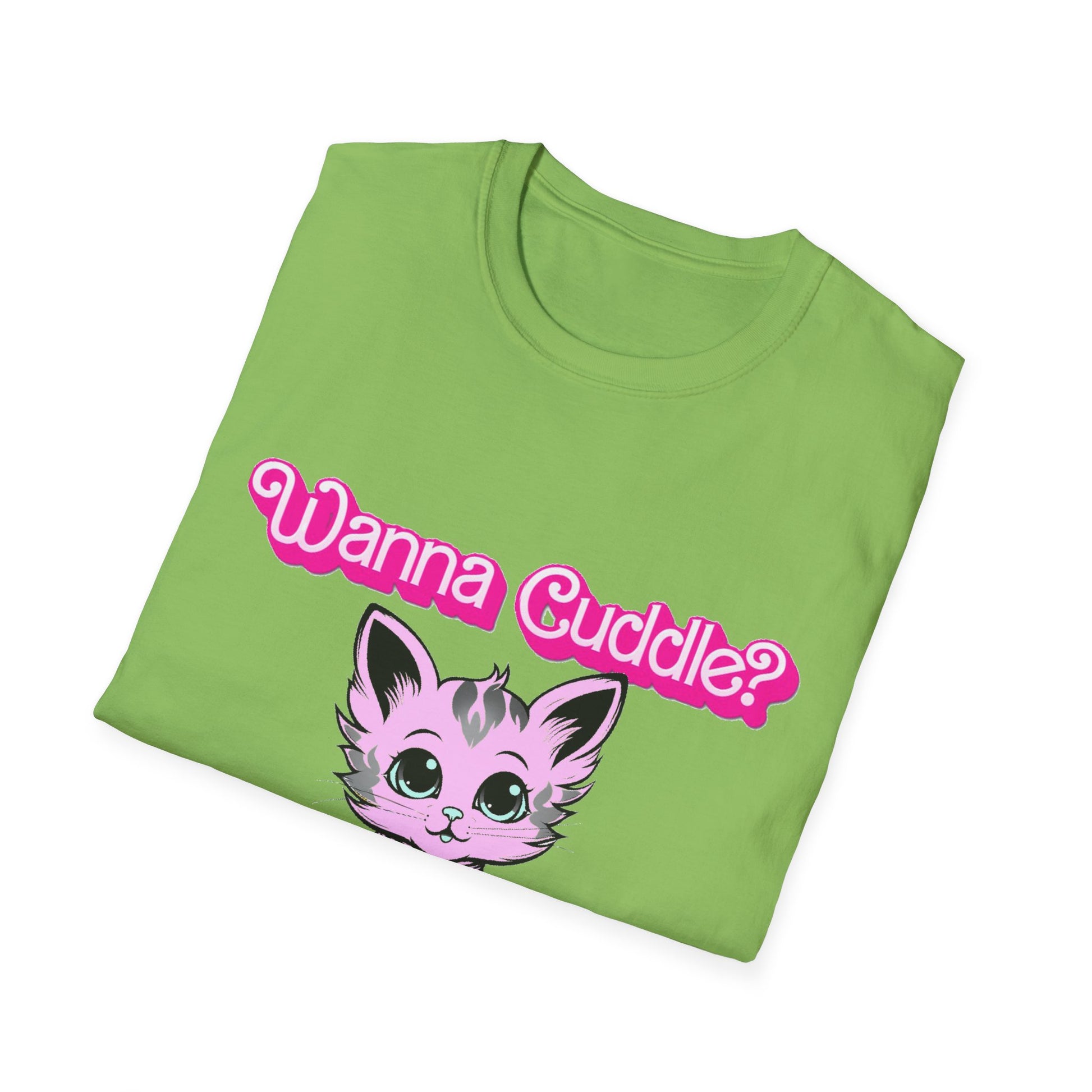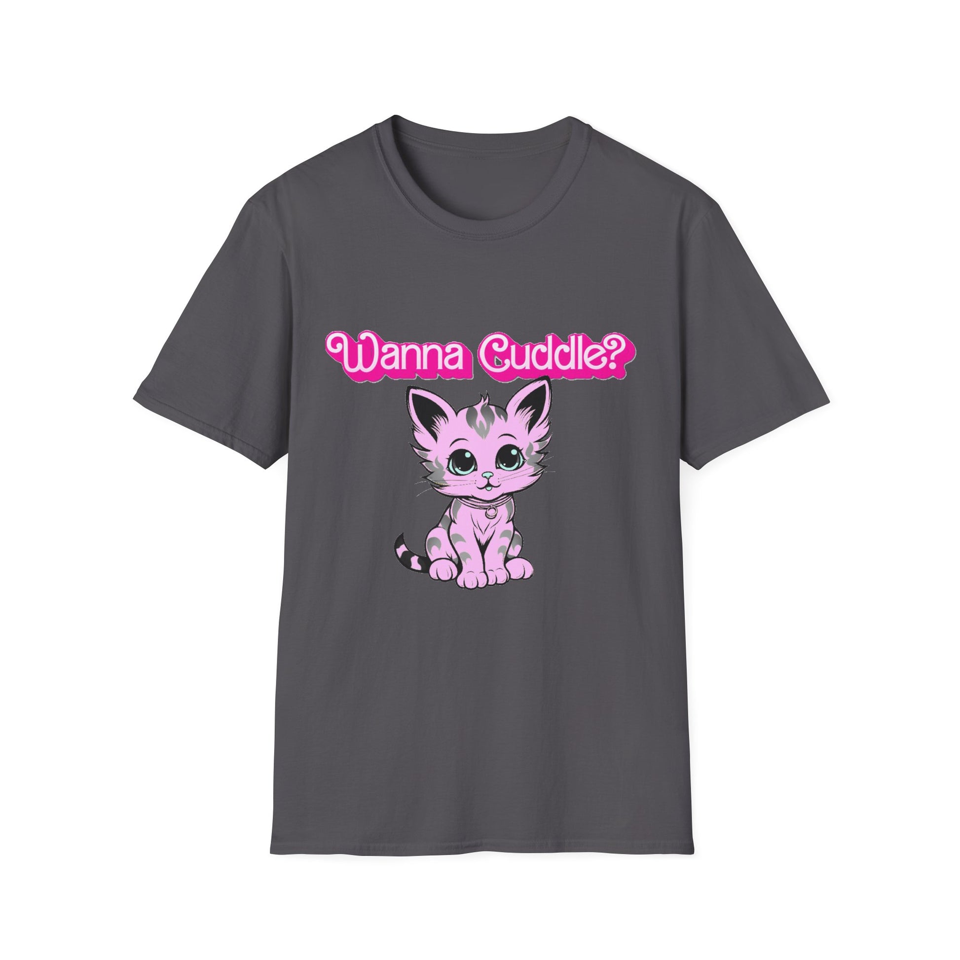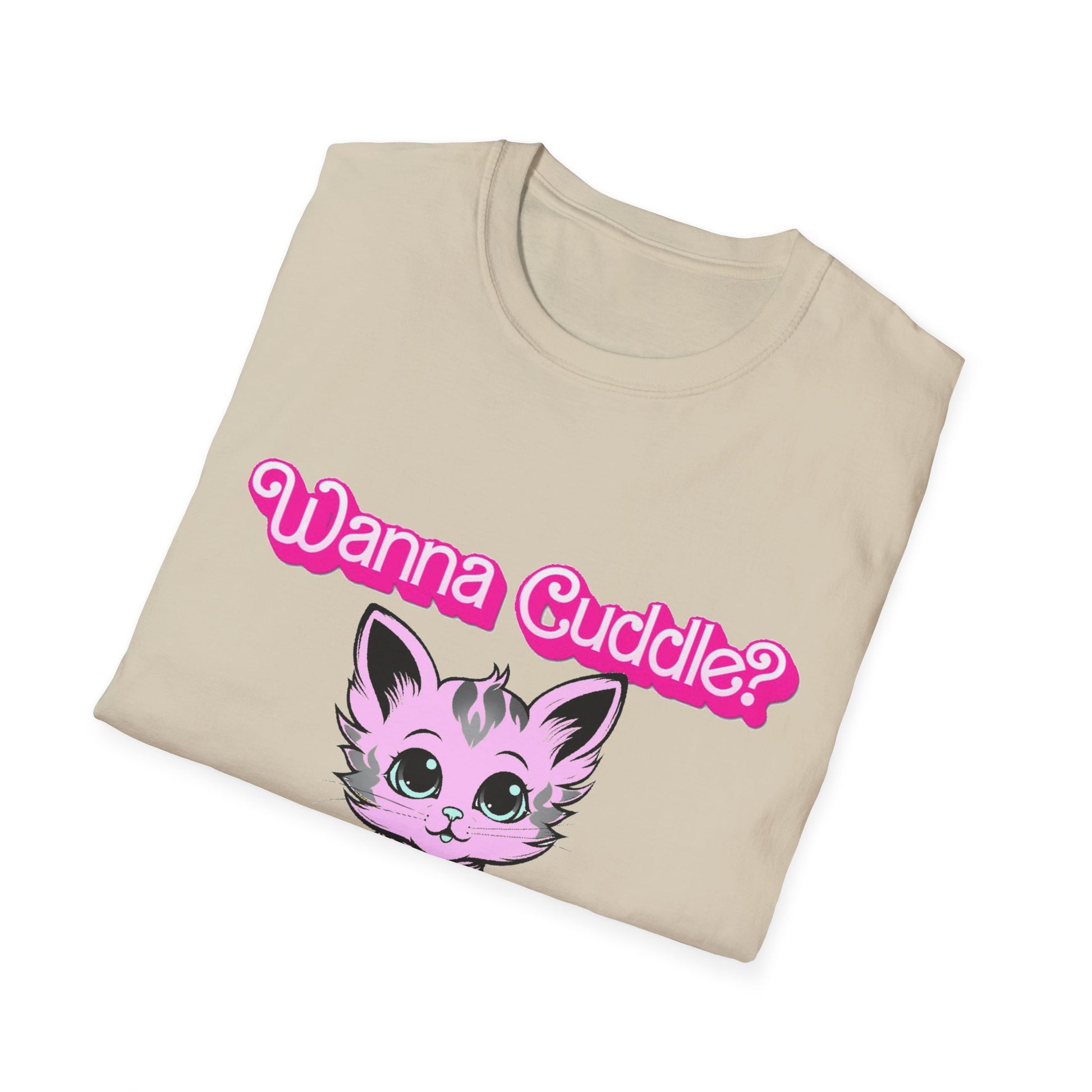 Cute Cat Face Unisex T-Shirt, Wanna Cuddle Provocative Proposition Graphic Tee, Retro Design Soft Pink Text Front Print