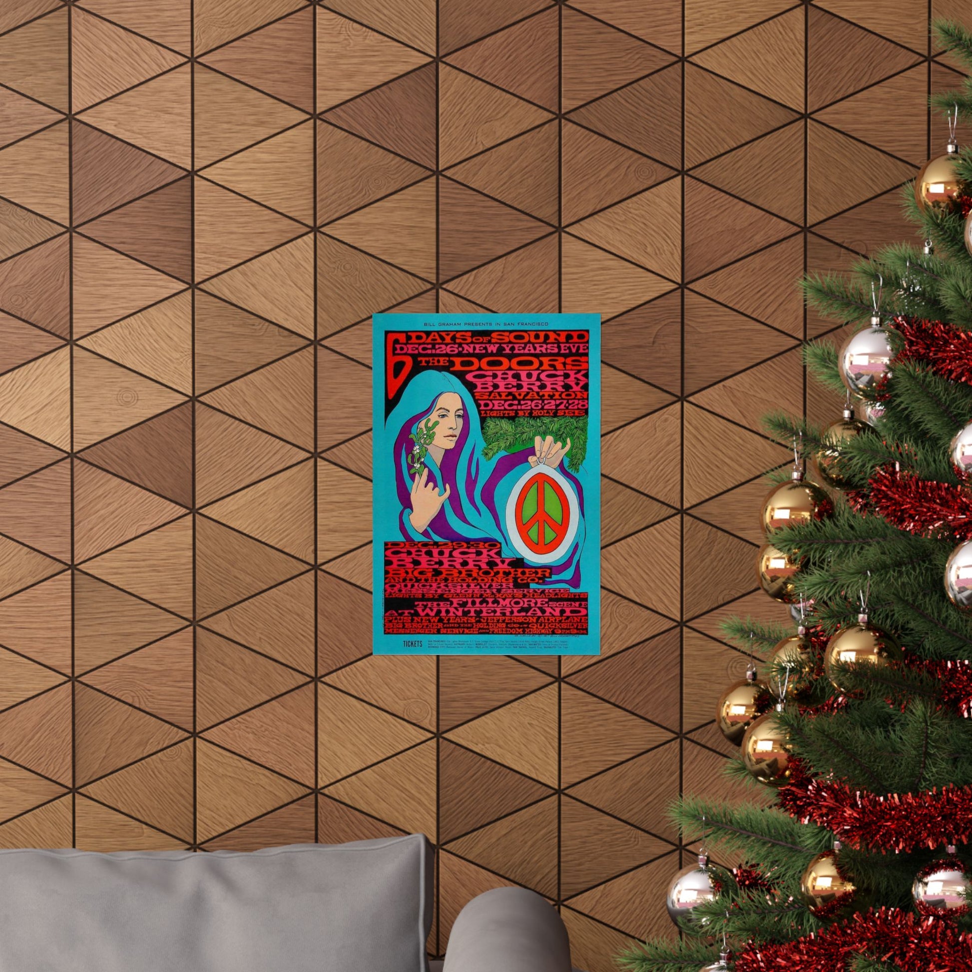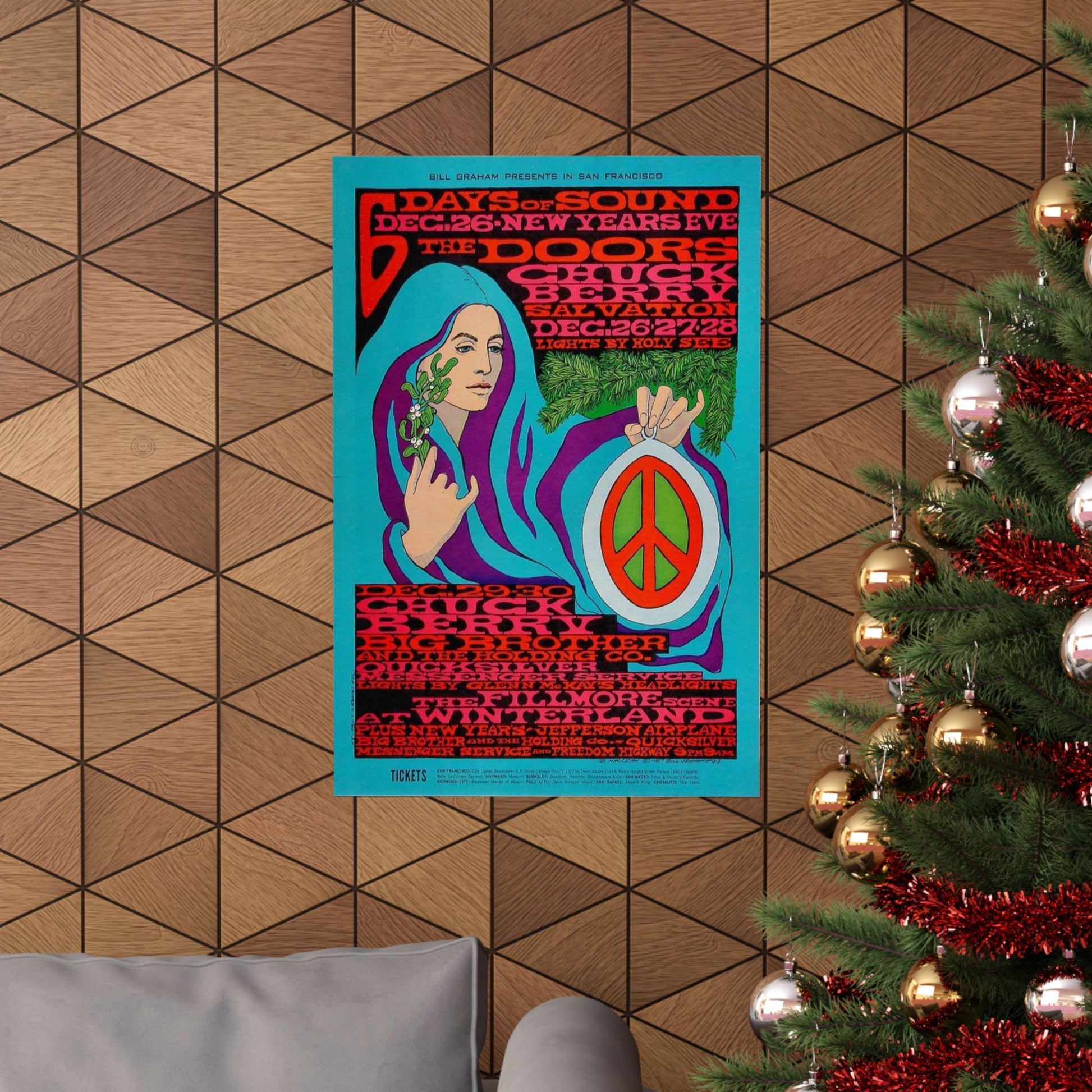 5. MacLean's Iconic Style: The artwork, featuring a beautiful woman with flowing blue and purple hair holding a peace sign ornament and a sprig of mistletoe, is one of Bonnie MacLean's most celebrated and recognizable designs. The flowing lines and intricate, highly stylized text are definitive elements of the late-period psychedelic poster movement, transitioning away from the more overtly illegible text of her predecessor, Wes Wilson.