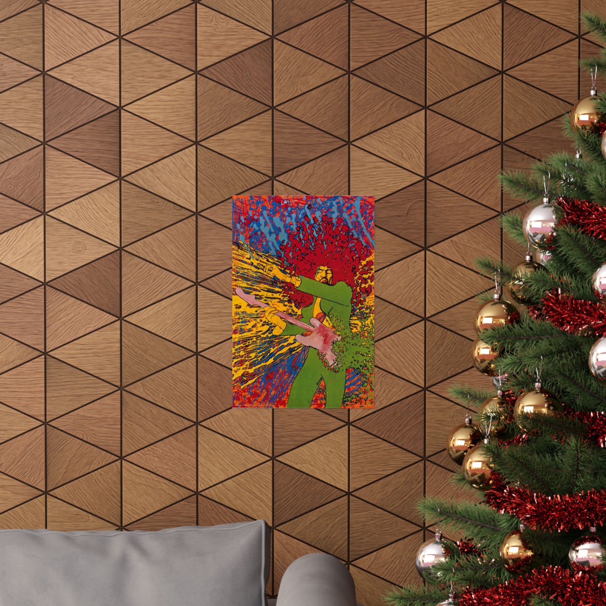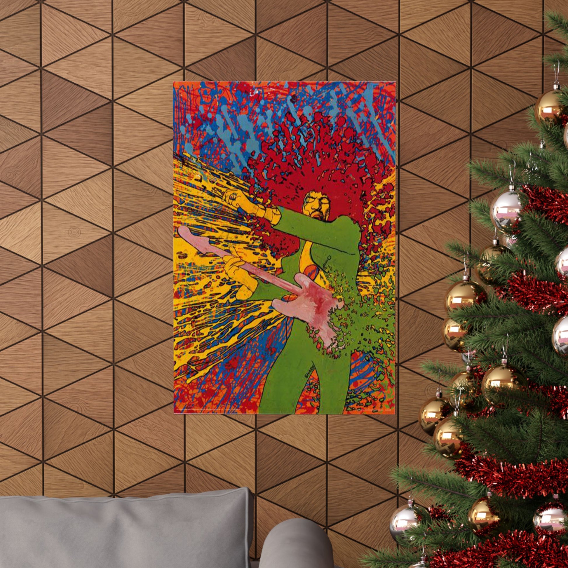● The Subject: Jimi Hendrix is depicted mid-performance, often based on a photograph by Linda Eastman (later Linda McCartney) taken in 1967.
